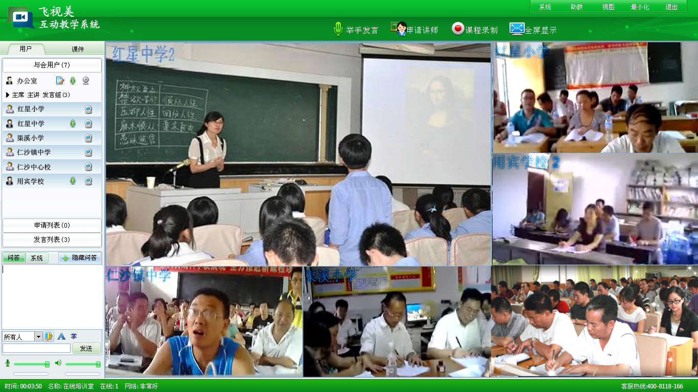 不僅如此,教師還可以借助飛視美視頻會議通過視頻、語音和學生現(xiàn)場互動,解答問題。學生可以在最短的時間里了解到最想知道的知識,通過飛視美遠程教學平臺,學生不用擔心聽不清楚老師的聲音,看不清楚老師的板書,不用擔心提出了一個簡單的問題后,被老師和同學嘲笑。這里沒有“前后桌”,這里沒有“冷板凳”。學生可以快樂的學習,縝密的思考,升華在學校里學到的知識。